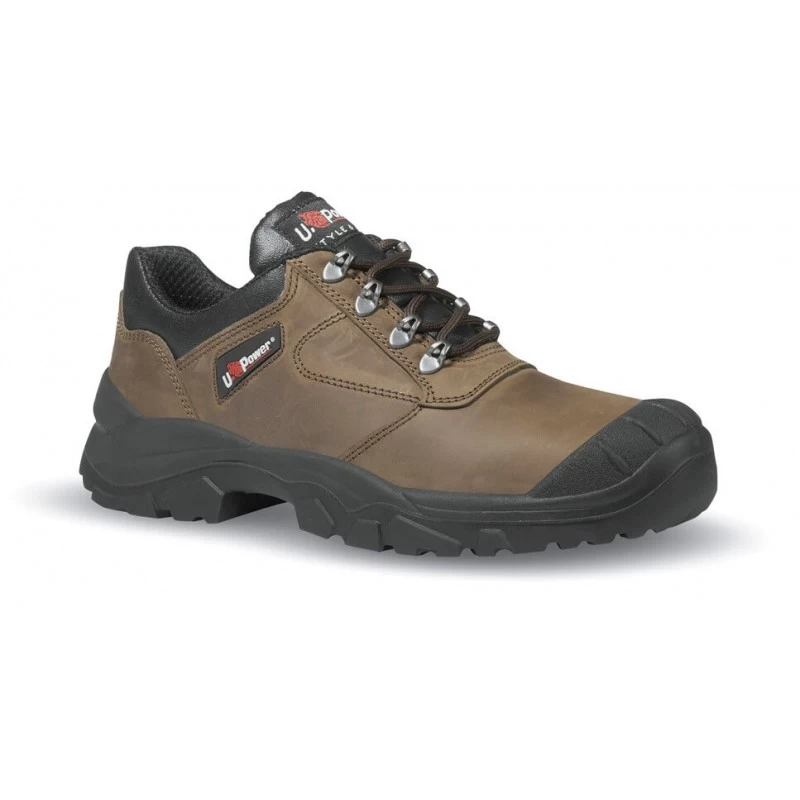 Tige en cuir pull up souple hydrofuge avec un sur-embout renforcé Coque de protection en acier résistance 200 joules Semelle anti-perforation acier et semelle d’usure en PU Coloris : Marron Pointure mixte du 35 au 48 Poids : 639 grammes pour un 42 Chaussure de sécurité basse renforcée modèle BC20483 Saba de marque U Power